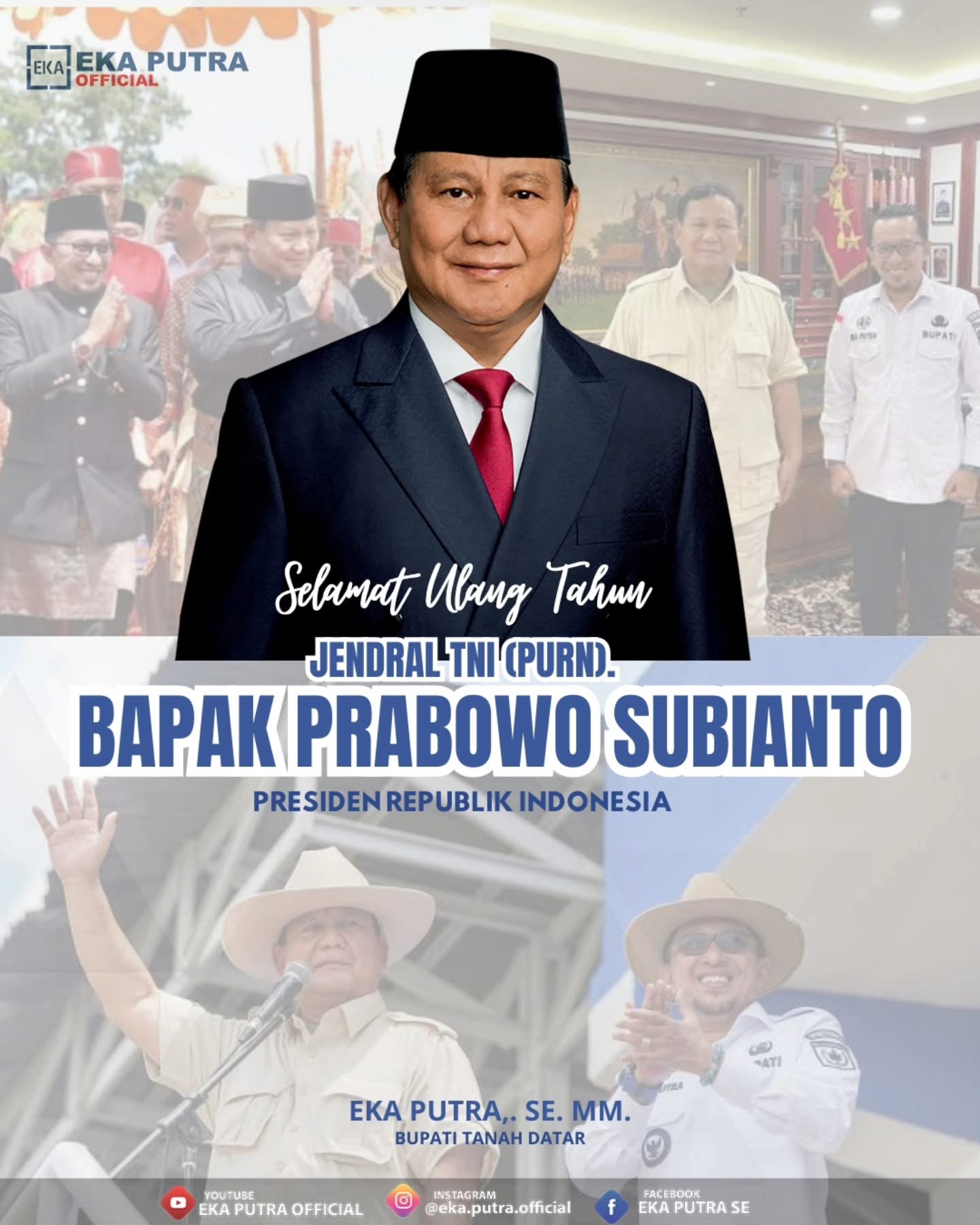 Tanah Datar, bakaba.net – Bupati Tanah Datar, Eka Putra, mengucapkan selamat ulang tahun ke-74 kepada Presiden Republik Indonesia, Prabowo Subianto, Jum’at (17/10).