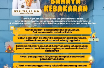Imbauan Waspada Bahaya Kebakaran Sehubungan kondisi cuaca panas yang mendominasi dalam beberapa bulan terakhir yang menyebabkan rentannya kejadian kebakaran di wilayah Kabupaten Tanah Datar, maka diimbau kepada masyarakat sebagai berikut: 1. Gunakan alat-alat kelistrikan secukupnya. Cek secara rutin ...