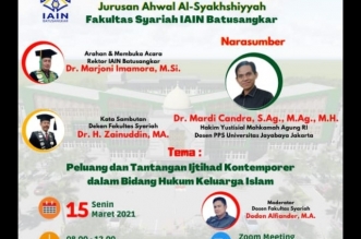BATUSANGKAR, bakaba.net – Hakim Yustisial Makamah Agung Republik Indonesia, Dr. Mardi Candra, M.Ag.,MH hadir sebagai pemateri dalam visiting Doktor yang gelar jurusan hukum Keluarga (ahwal al-syakhsyiyah Fakultas Syariah IAIN Batusangkar Senin (15/03/2021). Visiting doktor yang digelar secara virtual ...
