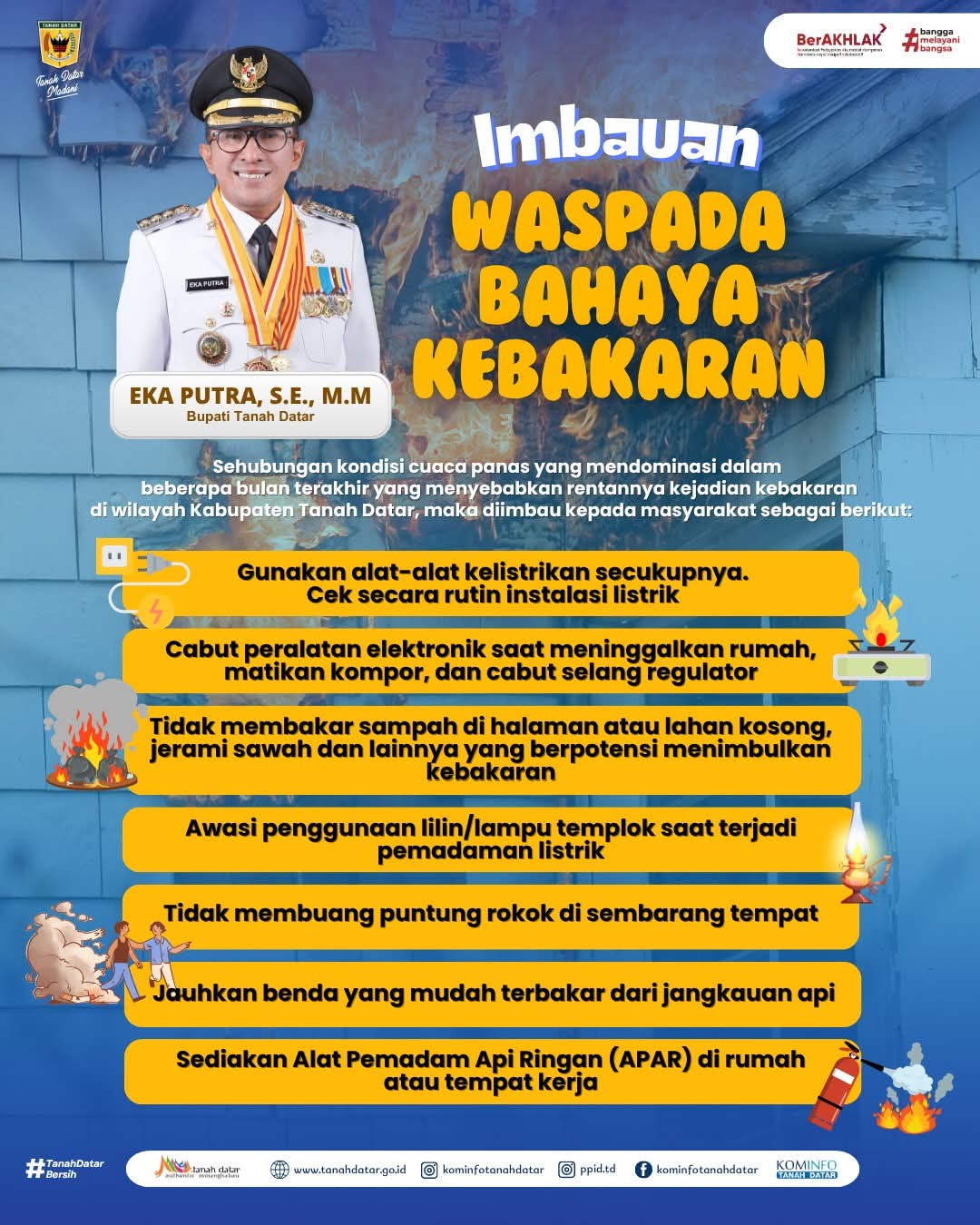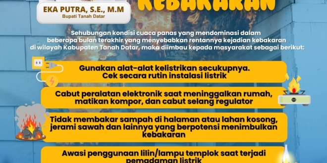 Sehubungan kondisi cuaca panas yang mendominasi dalam beberapa bulan terakhir yang menyebabkan rentannya kejadian kebakaran di wilayah Kabupaten Tanah Datar, maka diimbau kepada masyarakat sebagai berikut: