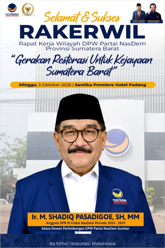 PADANG, bakaba.net – Anggota DPR RI Fraksi Partai NasDem sekaligus Ketua Dewan Pertimbangan DPW Partai NasDem Sumatera Barat, Ir. M. Shadiq Pasadigoe, S.H., M.M., mengucapkan selamat dan sukses atas terselenggaranya Rapat Kerja Wilayah (RAKERWIL) DPW Partai NasDem Provinsi Sumatera Barat yang digelar pada Minggu, 5 Oktober 2025, di Hotel Santika Premiere Hotel Padang, dengan tema “Gerakan Restorasi untuk Kejayaan Sumatera Barat.”