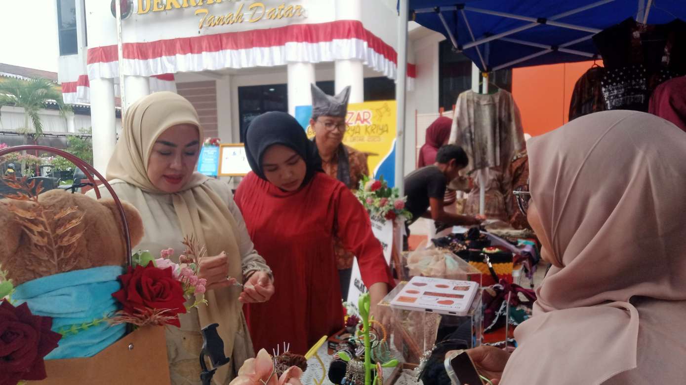 Usai pembukaan kegiatan Bazar Gelar Karya Kriya Kerajinan Tanah Datar tahun 2025, Ketua Dekranasda Tanah Datar Ny. Lise Eka Putra, di dampingi Ketua GOW Tanah Datar Ny. Dwinanda Ahmad Fadly, mengunjungi pameran dan membeli hasil produk IKM Tanah Datar. (***)