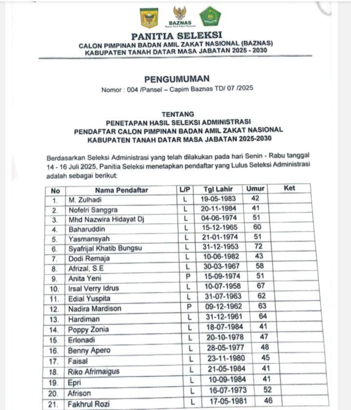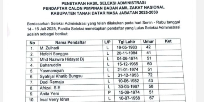 Tanah Datar, bakaba.net – Penetapan Hasil Seleksi Administrasi Pendaftaran Calon Pimpinan Badan Amil Zakat Nasional Kabupaten Tanah Datar Masa Jabatan 2025-2030