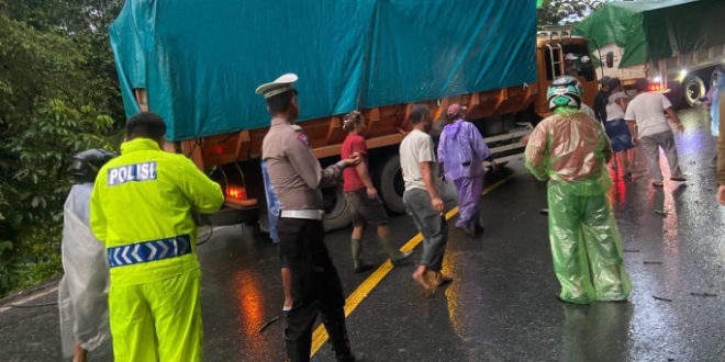 Padang Panjang, bakaba.net – Satuan Lalu Lintas Polres Padang Panjang mengevakuasi truk tronton nopol BA 9788 AU yang mengalami laka tunggal di tanjakan Cubadak Bungkuak Kelurahan Silaiang Bawah Kota Padang Panjang, Sabtu (18/10).